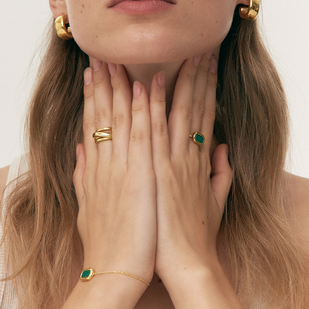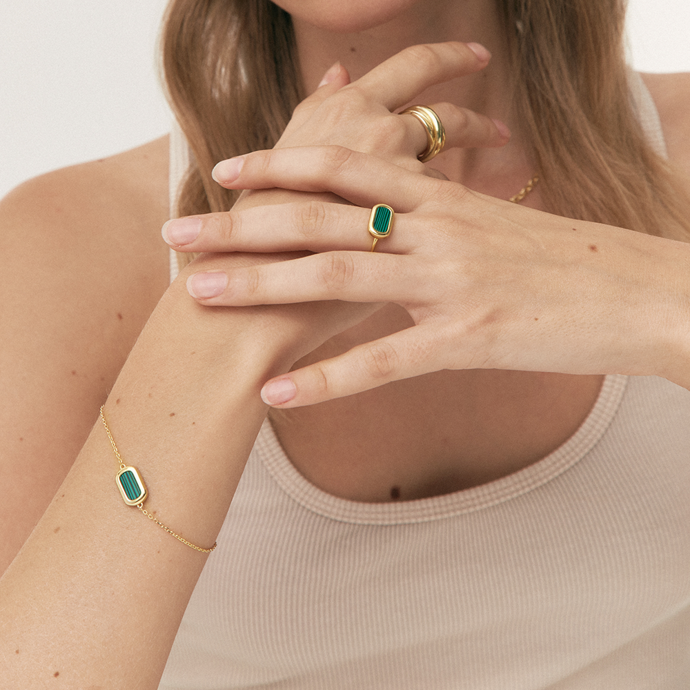 ¿Eres fan del mix & match? Te recomendamos hacerte con el collar Malaquita, el anillo Malaquita y los pendientes Malaquita.