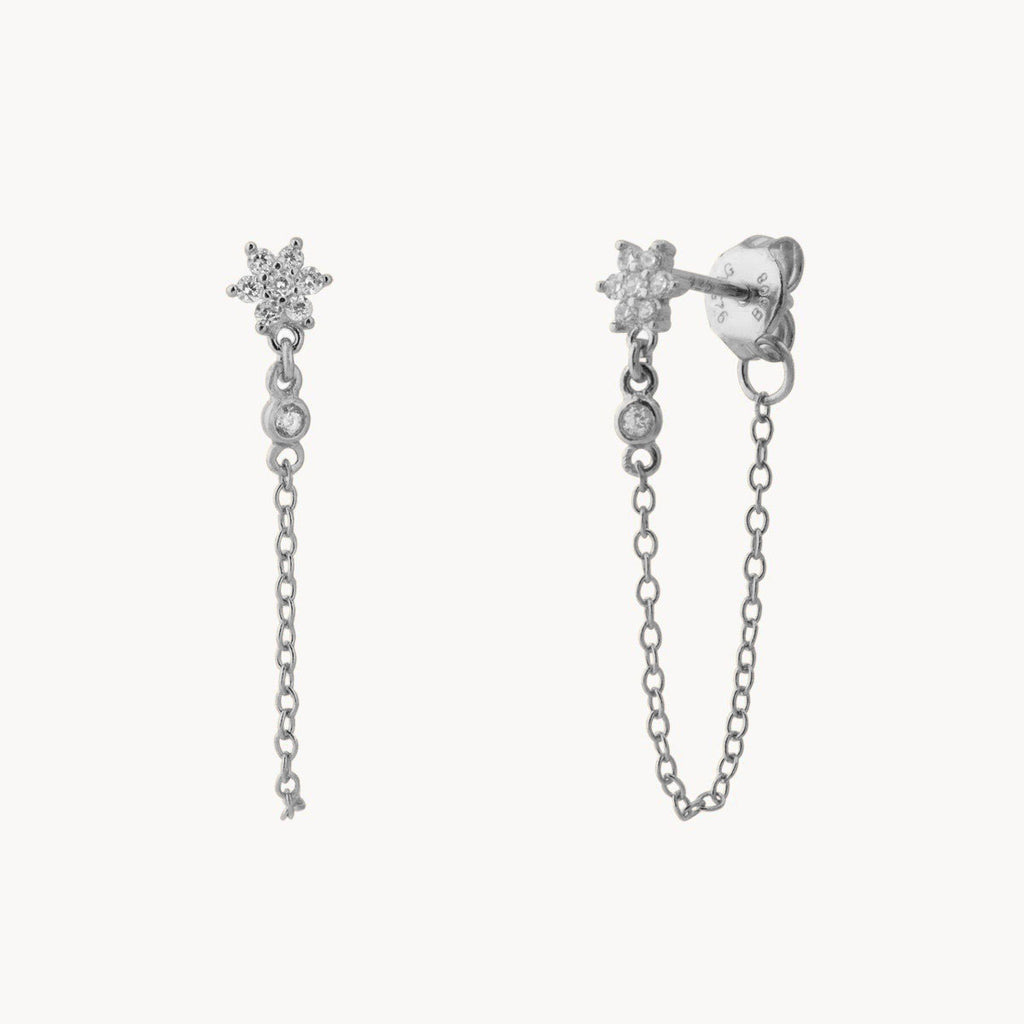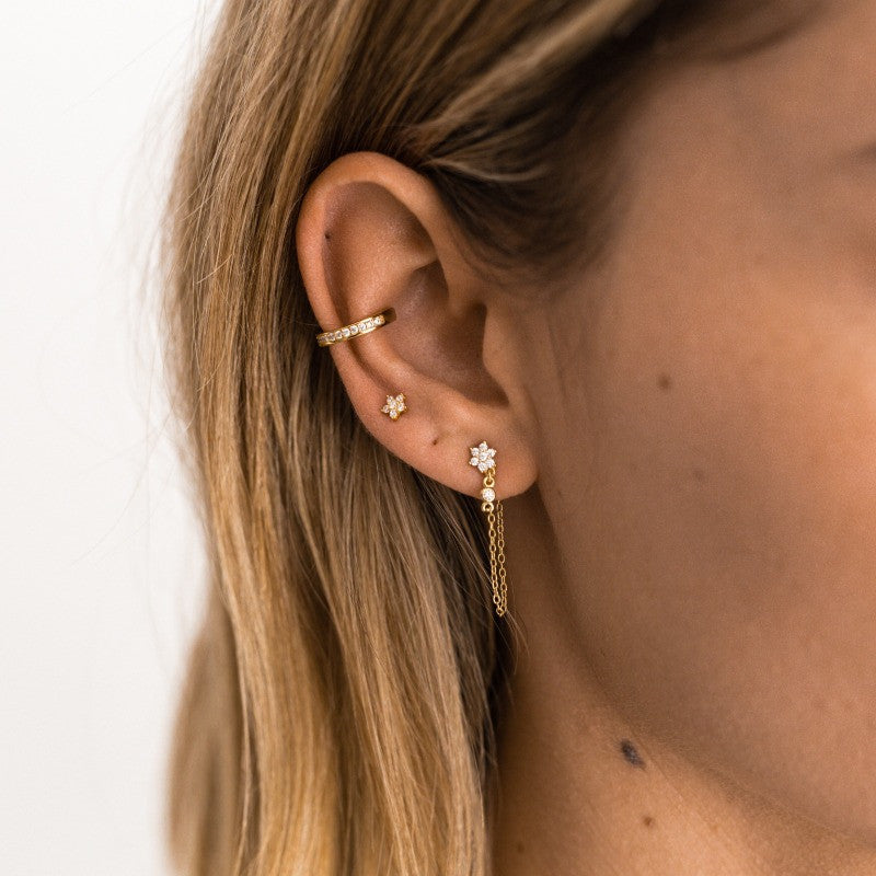Roxas son unos pendientes con una flor de circonita blanca y una fina cadena de oro que envolverá tu oreja de delante a atrás .